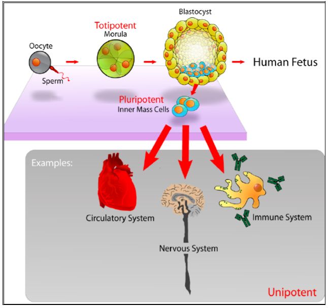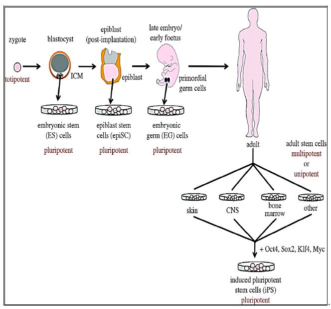 خلايا جذعية جنينية تنشأ ككتلة من الخلايا داخل Blastocyst ، ويمكن ان تتخصص الى انواع متعددة من الانسجة في الجسم ما عدا المشيمة التي تنشأ من Totipotent. تتضاعف ذاتيا في الانسجة التي تنشأ فيها ويمكن ان تكون اي نسيج او عضو ، ويمكن ان تعطي 200 نوع من الخلايا من امثلتها Embryonic Stem (ESCs) Cells :