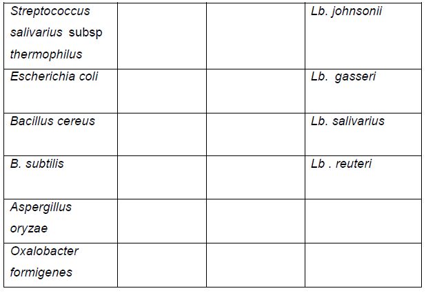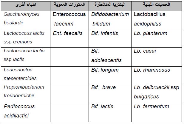 احياء اغلبها من البكتريا تضفي فوائد صحية عند وجودها او تناولها ويمكن ان تقسم الى مجاميع كما في الجدول الاتي :