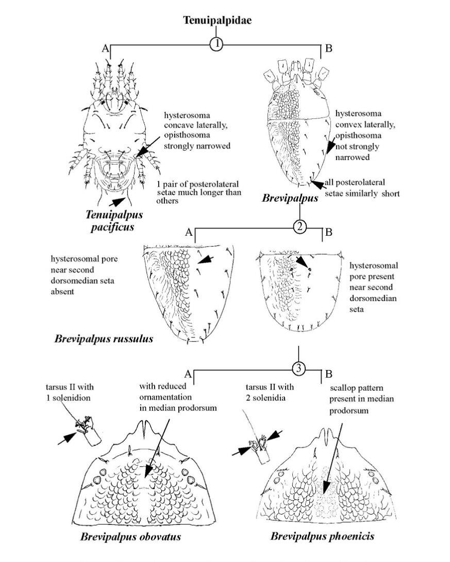 الشكل (1) مفتاح لأجناس وانواع الحلم العنكبوتي الكاذب في الزراعة المحمية Tenuipalpus pacificus تم اعادة رسمه وتحويله عن Baker (1945) و Brevipalpus russulus من Jeppsen وأخرون (1975).