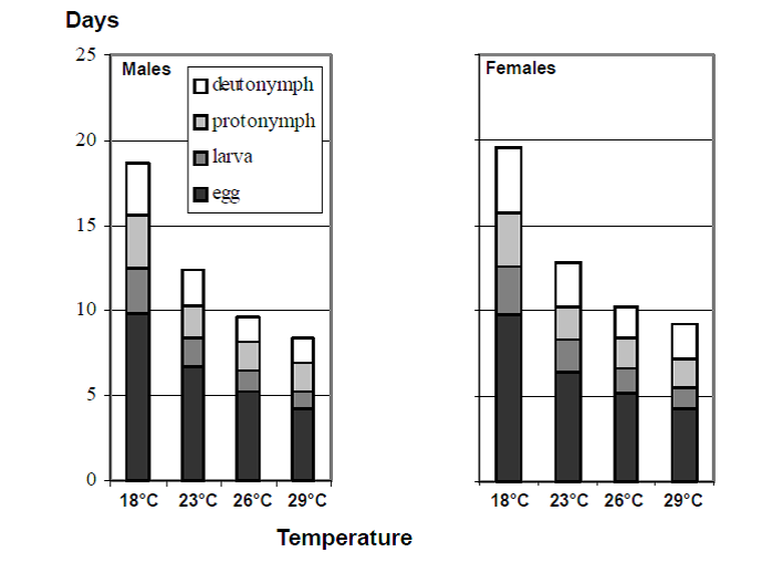 يبدأ نمو الحلم وتطوره فوق 10م وتموت جميع اطواره عند درجة حرارة 40م، فترة الجيل تكون قصيرة عند ارتفاع درجة الحرارة وتستغرق 10 ايام عند درجة حرارة 25م (الشكل التالي) والتي تمثل الدرجة الحرارية المثلى، وعند هذه الدرجة تعيش الانثى لمدة 9 ايام وتضع 25 بيضة كمتوسط. النسبة الجنسية تميل لصالح الاناث بنسبة 70%، وتعد نسبة الرطوبة 65% هي الرطوبة المثالية لتطور الحلم وتكاثره. هذا النوع من الحلم يفضل الاجواء المعتدلة، حيث أن الرطوبة المنخفضة والحرارة المرتفعة تعدان من العوامل المحددة لنمو سكان هذا الحلم.