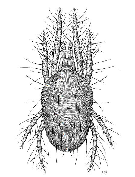 6-) أن منطقة الجسم Idiosoma مغطاة بكيوتكل مخطط (الشكل التالي) وان شكل الخطوط وحجمها وكثافة الفصوص أو الدرينات المنتشرة على الجسم، تكون ذات فائدة للتمييز بين الأنواع.