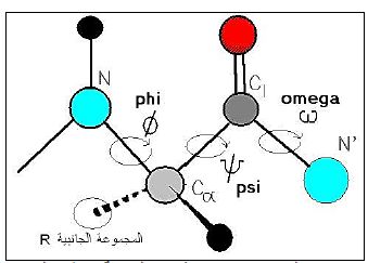 وتتراوح قيم الزوايا بين +180ºالى -180º ، فالدوران باتجاه عقرب الساعة يعطي الزوايا قيم موجبة وبالعكس ولذلك تسمى هذه الزوايا في بعض الأحيان بزوايا الانفتال Torsion Angles .ان توائم الزاويتين ليس مطلقا كما انه في بعض الأحيان لا توجد توافقية نتيجة لتصادم الذرات ، وهذه العلاقات تحدد بمخطط راماجاندران الموضح في الشكل الاتي :