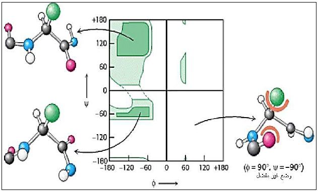 والشكل يوضح قيم الزوايا φ وψ التي يمكن ان توجد بين الذرات فيشير الشكل مثلا الى انه عندما تكون φ قائمة و ψ قائمة بالاتجاه المعاكس (اي قيم سالبة) فهو وضع غير ملائم. ويشير الشكل ايضا الى ان ثلاثة أرباع وحدة الدائرة (وحدة الدائرة بأرباعها الأربعة في القياسات الرياضية) لا تكون ملائمة وان هناك قيم خاصة فقط هي التي تسمح بان يكون توزيع الذرات ملائما كما موضح في اللون الأخضر الغامق والأقل منها تفضيلا والأخضر ألفاتح ، اذ ان القيم العامة تؤدي الى عمليات تصادم بين الذرات وتؤدي الى استبعاد الذرات والتي تكون من الأساسيات المميزة لتوزيع الذرات المجسم وذلك لانه لا يمكن ان تكون ذراته في المكان نفسه وفي الوقت نفسه ، وجزء من هذا التأثير تضفيه السلاسل الجانبية للحوامض الامينية من حيث صفات حجمها او مجاميعها الفعالة او غيرها من الصفات.