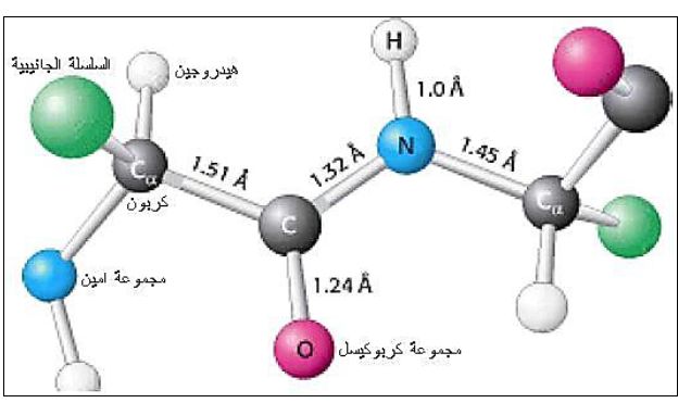 وبالعودة الى الحقائق المذكورة سابقا وفحص هيكل البروتين تتضح عدة حقائق منها ان الآصرة الببتيدية هي مستوية بشكل أساس وعليه فعند ارتباط اثنين من الحوامض الامينية فان الست ذرات المكونة لهما ستكون في المستوى نفسه (افتراضا) ، والحقيقة الأخرى ان الآصرة الببتيدية تمتلك بعض صفات الأواصر المزدوجة نتيجة اشتراك الكترونات بين الذرات O=C-N والتي تمنع دوران الذرات حولها وهذا ما يؤدي الى استواء الآصرة اي تكوين مستوى الآصرة Peptide Plane، ونظرا للتركيب الصلد الذي تبديه الآصرة الببتيدية وثبوتيتها فهي تجبر الذرات المرتبطة بها على ان تقع في المستوى نفسه ولكن بتقيدات |(كما ذكر آنفا). وصفة الآصرة المزدوجة التي تمتلكها يعبر عنها بطول الآصرة التي تربط بين CO و NH فطول الآصرة بين C-N هي 1.32 انكستروم في حين ان الآصرة المفردة (العادية) بين C-N تبلغ 1.49 انكستروم اما في حالة وجود الآصرة المزدوجة بين العنصرين C=N فتكون قيمتها 1.27 انكستروم والشكل التالي يوضح أطوال الأواصر :