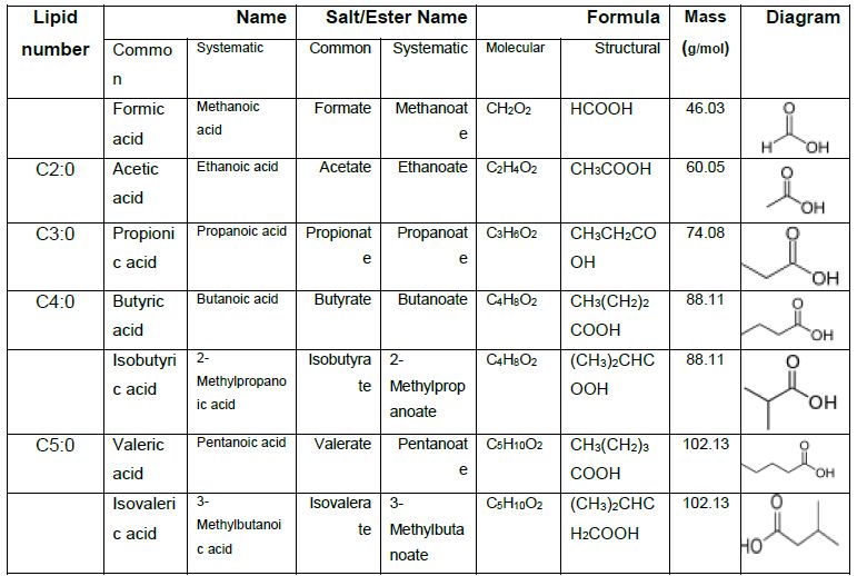 حوامض دهنية تسمى ايضا الحوامض الدهنية الطيارة VFAs ولها ذيل من Aliphatic Chain بطول اقل من ست ذرات ومنها المذكور في الجدول ادناه :