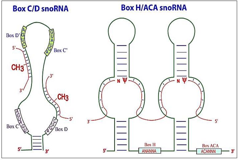 ذات العلاقة بالمثيلة ، فمثلا rRNA البشري يحوي على 115 مجموعة مثيل وهي O-ribose- methylations اذ ترتبط مجموعة المثيل الى سكر الرايبوز والصنف الثاني H/ACA box snoRNA