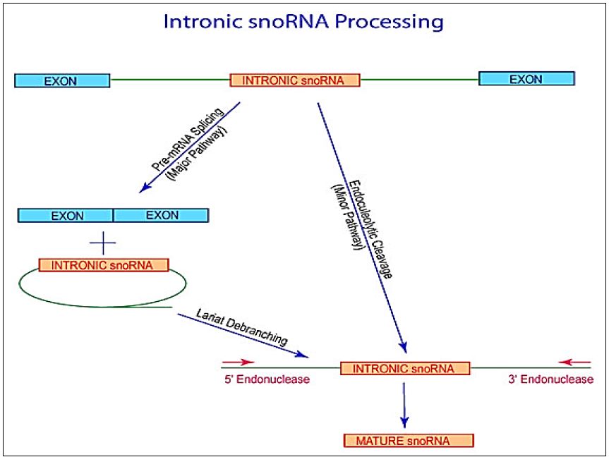 Small Nucleolar RNA صنف من جزيئات RNA الصغيرة تشتق من الجينات الموجودة في النوية تقوم بقيادة التحويرات الكيماوية لجزيئات RNA الاخرى خاصة الجزيئات الرايبوزومية و tRNA النووية الصغيرة لذا تعرف على انها Guide RNAs. توجد في انوية الخلايا حقيقية النواة وتكون احد مكونات Ribonucleoproteins ويوجد منها صنفان C/D box snoRNA