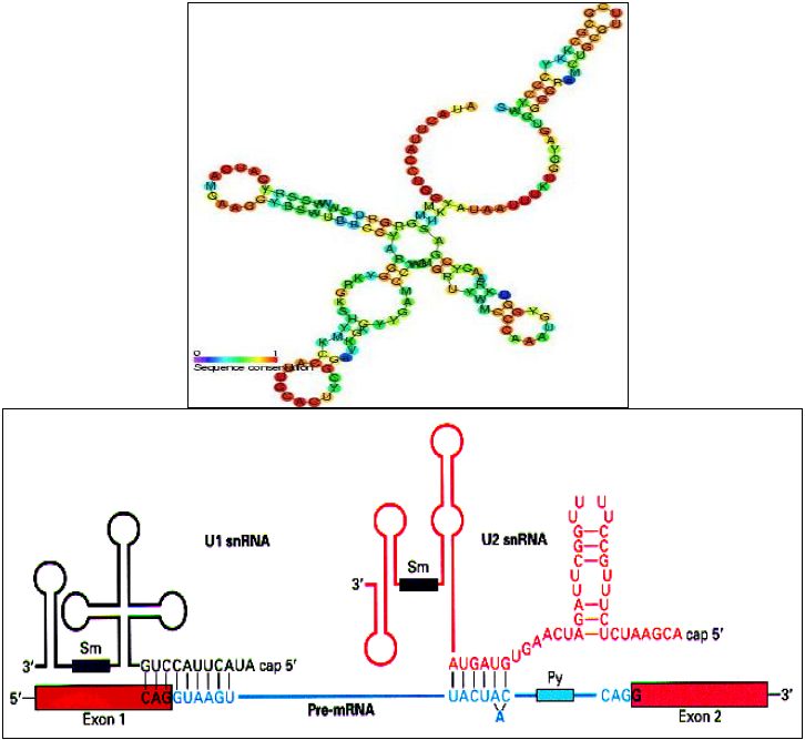 Small Nuclear RNA مجموعة من جزيئات RNA غير مشفرة موجودة في النواة تعمل في خياطة RNA وتفاعلات معالجة RNA الاخرى . يصل طولها من 100 - 300 قاعدة وترتبط ببروتينات نووية snRNPs) Ribonucleoproteins) يصل عددها الى حوالي 145 بروتين تساهم في معالجة RNA مثل Splicing و Polyadenylation وكذلك تجميع جسميات الخياطة Spliceosomes وتمييز مواقع الانفلاق