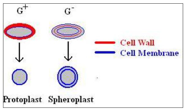 والبروتوبلاست تعني عادة ازالة الجدران من البكتريا الموجبة لصبغة كرام ، اما Spheroplast فتعني ازالة الجدران الخلوية من البكتريا السالبة لصبغة كرام ، وذلك لان في البكتريا الموجبة لصبغة كرام يوجد غشاء واحد ،اما في البكتريا السالبة لصبغة كرام فيوجد غشاءين ، الداخلي (الغشاء الخلويCell Membrane) والخارجي Outer Membrane،ولذلك يمكن انتاج بوتوبلاست من الاخيرة بازالة الغشاء الخارجي . وبذا يكون تركيب البروتوبلاست محاط بغشاء واحد اما Spheroplast فيكون محاط بغشائين ، لان الازالة تكون بشكل اساسي لل Peptidoglycan أي التراكيب الجدارية .