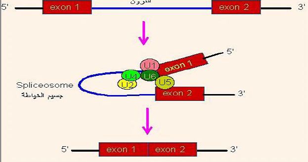 الآلية او العملية التي تتم بها عملية الفلق والخياطة ، وهي عملية معقدة تشمل اشتراك في الأقل 5 من جزيئاتRNA النووية الصغيرة Small Nuclear RNA) snRNA )هي U6 ، U5 ،U4 ،U2 ، U 1 . وU 3 لا يشترك في عملية الخياطة وانما يعمل في معالجةpre-rRNA وفضلا عن هذه الجزيئات يشارك عددا من البروتينات الرايبوزية مكونة جسيم الخياطة Spliceosome الذي له معدل ترسيب 60S ويجري عدد من التفاعلات الإنزيمية تكون القاعدة Aالموجودة ضمن التواليات المعنية دورا رئيسا فيها ويتم إزالة الانترونات ثم ربط الاكسونات المتجاورة مع بعضها كما موضح في الشكل :