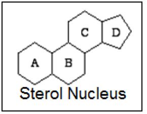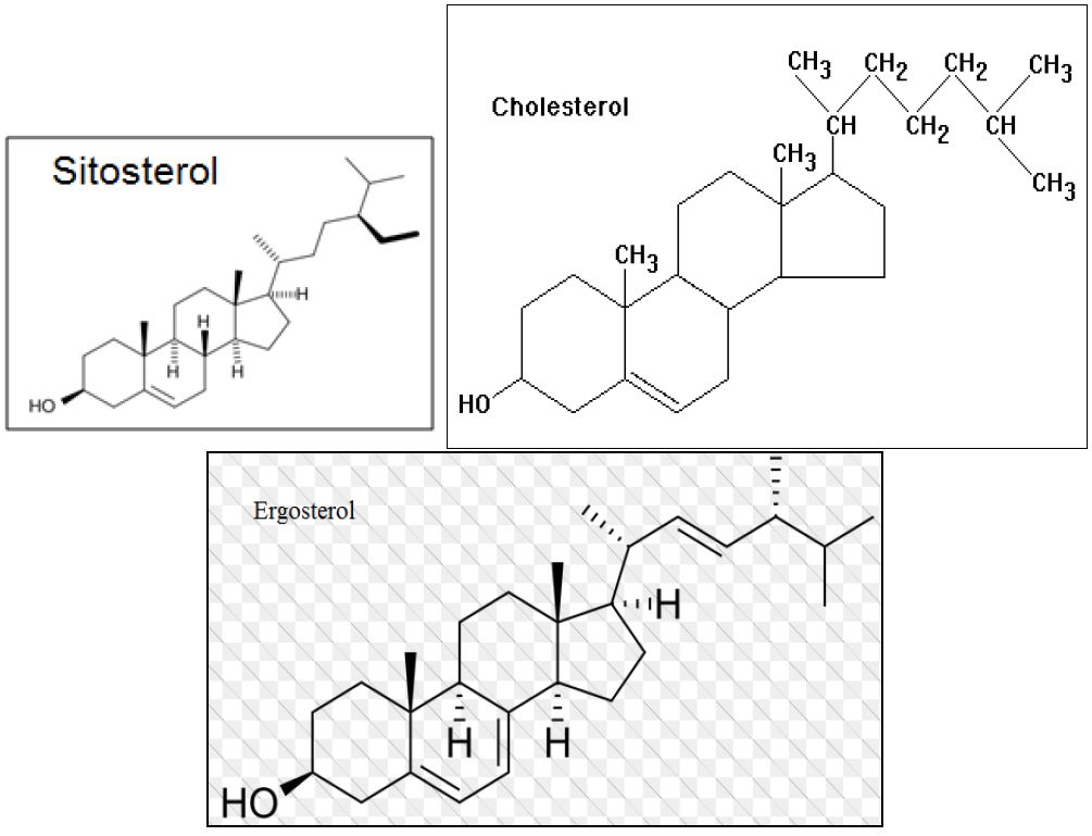 فضلاً عن سلسلة جانبية مؤلفة من 8-10 ذرات كربون ومجموعة كحولية . وعلى الرغم من ان الستيرولات توجد في الدهون الحيوانية والزيوت النباتية على حد سواء الا ان هناك اختلافاً كبيراً من الناحية الحيوية بين الستيرولات الحيوانية والنباتية . ويطلق على السيترولات الحيوانية Zoosterol مثل Cholesterol وLanosterol أما النباتية فيطلق عليها Phytosterol ومنها B – Sitosterol، والسترولات الفطرية يطلق عليه Mycosterol ومنها Ergosterol .
