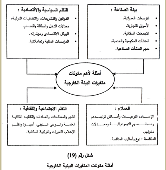يتضح لنا من الشكل السابق انه يجب ان تشمل عملية تحديد وتحليل عناصر الاوضاع الخارجية أنواع تلك المتغيرات والأوضاع على مستوى نطاق التأثير وايضا حسب مدى استقرارها وتغيرها وايضا مستوى بساطتها وتعقيدها. ومن المنطقي ان تكون البداية هي تحديد المتغيرات على مستوى نطاق التأثير (المستويات الثلاث السابقة) مع الأخذ في الحسبان مستوى التعقيد والتغيير ومن ثم تتمثل تلك العناصر فيما يلي: