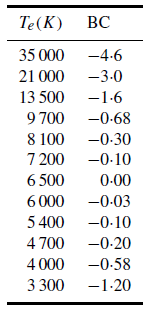 The ratio Bbol/BV has a minimum value for a star with a temperature providing the maximum in its energy envelope at the same wavelength as the peak sensitivity of the selective detector. For the V -band system, this occurs when the temperature is close to 6500 K. The value of kbol is chosen so that the bolometric correction is zero for this temperature. Since Bbol/BV has a minimum value at this temperature, it is easy to demonstrate, using equation (4), that the bolometric correction is negative for stars with temperatures on either side of 6500 K. The bolometric corrections to V -band magnitudes are listed in table 1.