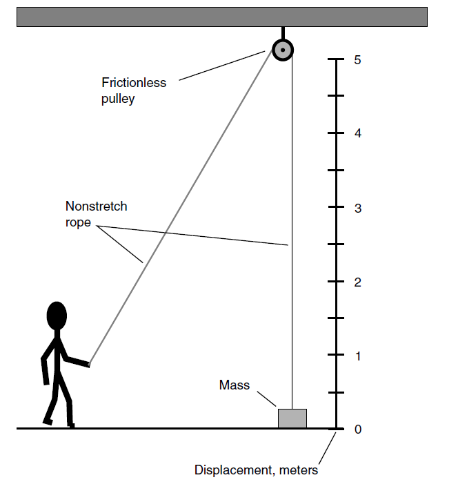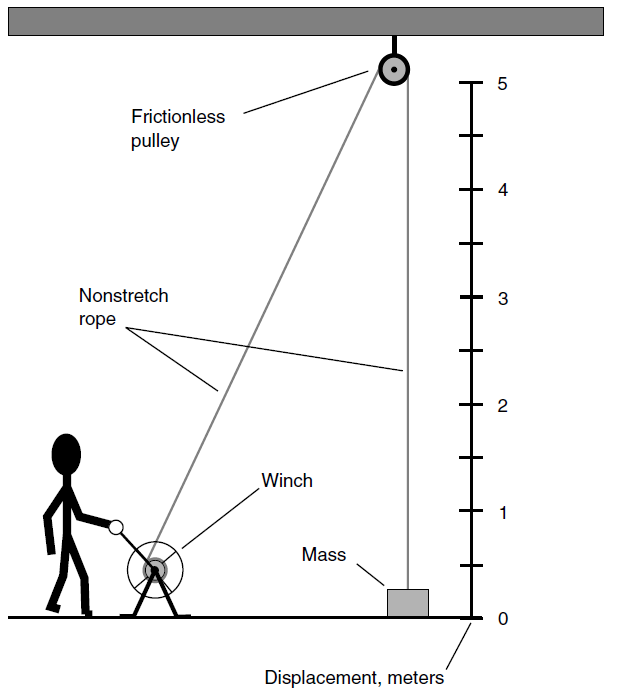 A slight variation on this theme can be used to talk about power. This is shown by Fig. 2. Suppose that instead of a free end of rope, you have a winch that you can turn to raise the object at the other end of the rope. The object starts out sitting on the floor, and you crank the winch (or use a motor to crank it) for the purpose of lifting the object. This, possibly in conjunction with a complex pulley system, will be necessary if you have a heavy object to lift. Then the pulley had better be strong! The same holds true for the rope. And let’s not forget about the manner in which the pulley is anchored to the ceiling.