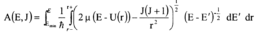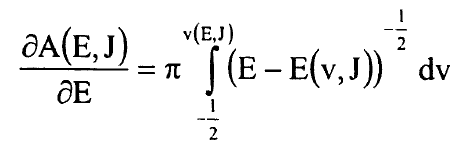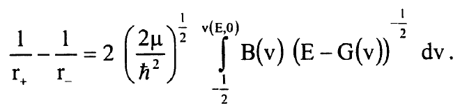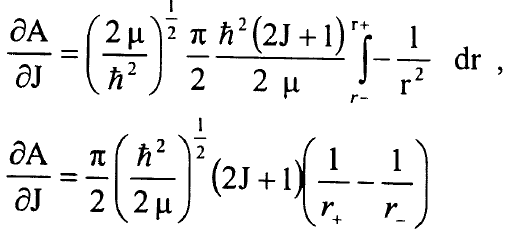 دول بسيطة لنقطتي التحول r+ وr- وهذه المشتقات يمكن التعبير عنها كتكاملات محتوية الدول G(v) وB(v) فقط ومتغير التكامل هو العدد الكمي الاهتزازي حيث G(v) الطاقة الاهتزازية وB(v) الثابت الدوراني معبر عنهما كدالة في v. ولان E=E (v,J) فمن الممكن تعريف v=v (E,J) وبالرغم من ان v وJ اعداد صحيحة لمستويات الطاقة الملاحظة فسوف تعتبر متغير مستمر في أية دالة. لنعرف الدالة A(E,J):