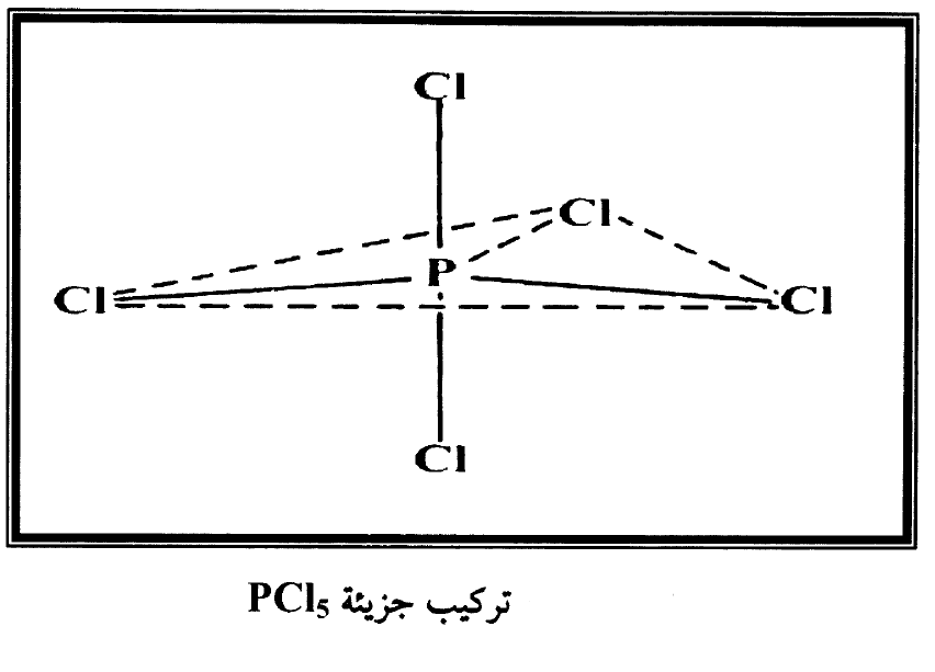 منخفضة الطاقة الى حد يجعلنا نفترض انها مسئولة عن الترابط في مركبات هذه العناصر. فمثلا في PCI5 توجد عشرة الكترونات تكافؤ متضمنة في تآصر خمس ذرات كلور الى الفسفور ومخطط التهجين مبني على ترقية الكترون 3s واحد للفسفور الى مدار 3d لينتج خمسة مدارات sp3d هجينة وتتنبأ بشكل صحيح بالتركيب الهرمي الثلاثي كما مبين في شكل (1).