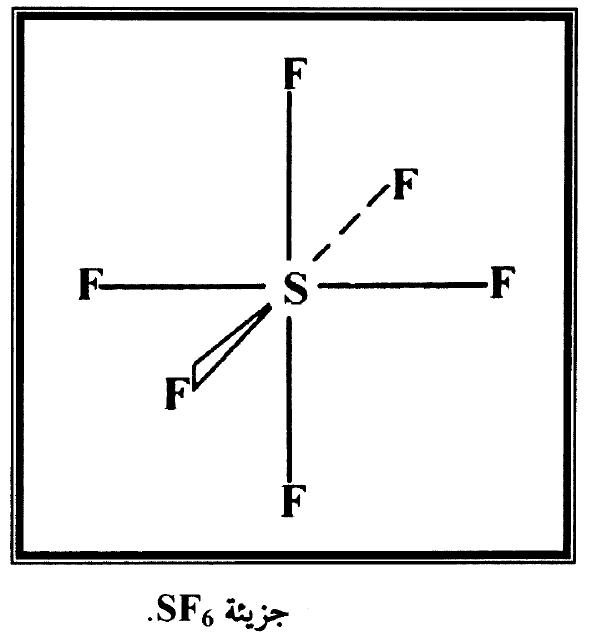 في جزيئة SF6 توجد ست اواصر متكافئة بين ذرة كبريت وست ذرات فلور وشكل الجزيئة في الفضاء مجسم ثماني منتظم كما في شكل (2) ويمكن تفسير عدد الاواصر وشكل الجزيئة في الفضاء بافتراض ترقية الكترون 3s واحد وترقية الكترون 3p واحد الى مدارين من مدارات 3d في ذرة الكبريت وهذا التهجين ينتج ستة روابط هجينة متكافئة sp3d2 ومتجهة كما مبين في تركيب جزيئة SF6.