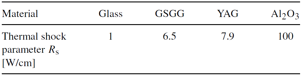 is a “thermal shock parameter.” A larger Rs indicates a higher permissible thermal loading before fracture occurs. Table 1.1 lists typical values for a number of laser materials if we assume a standard surface treatment.