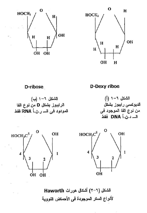 D-Deoxy ribose وتعود التسمية لهذين الحامضين النووين إلى نوع السكر الخماسي الموجود (انظر إلى اشكال Haworth) لأنواع السكر الموجودة في الأحماض النووية في الشكل (٢-٦).