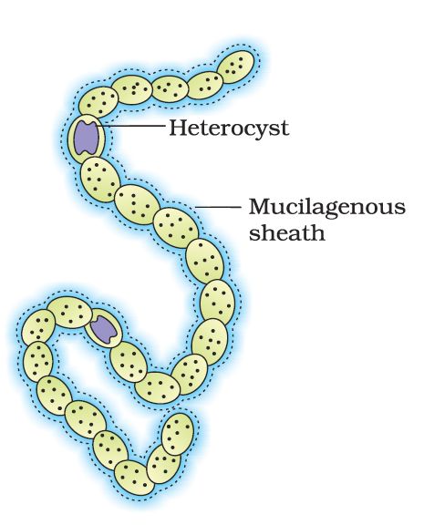 There are thousands of different eubacteria or ‘true bacteria’. They are characterised by the presence of a rigid cell wall, and if motile, a flagellum. The cyanobacteria (also referred to as blue-green algae) have chlorophyll a similar to green plants and are photosynthetic autotrophs (Figure 2.). The cyanobacteria are unicellular, colonial or filamentous, freshwater/marine or terrestrial algae. The colonies are generally surrounded by gelatinous sheath. They often form blooms in polluted water bodies. Some of these organisms can fix atmospheric nitrogen in specialised cells called heterocysts, e.g., Nostoc and Anabaena. Chemosynthetic autotrophic bacteria oxidise various inorganic substances such as nitrates, nitrites and ammonia and use the released energy for their ATP production. They play a great role in recycling nutrients like nitrogen, phosphorous, iron and sulphur.