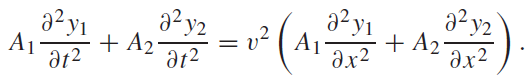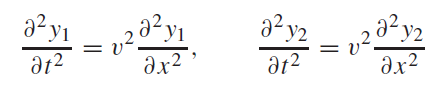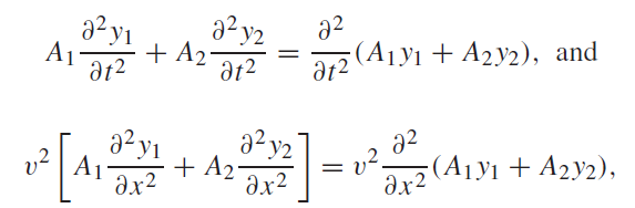 where A1 and A2 are arbitrary constants. This result follows at once from the linearity of the wave equation (1), i.e. each term in the wave equation is proportional to y or one of its derivatives: it does not contain quadratic or higher-power terms or product terms such as y(∂y/∂x). (Equations of this type are known as linear equations.) We can see this as follows. Multiplying the first of the following equations
