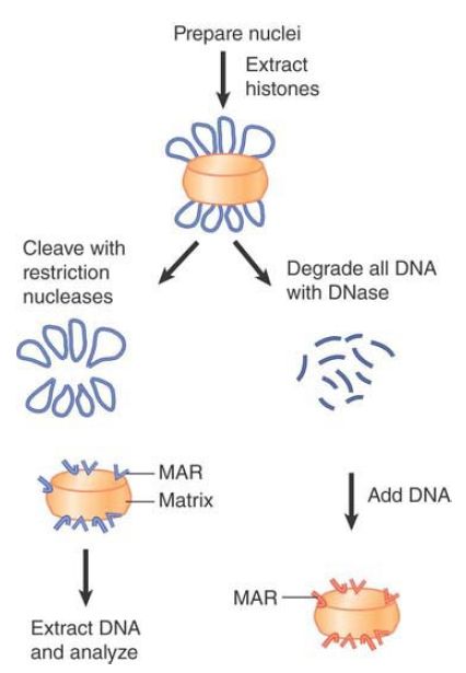 To analyze existing MARs that are bound to the matrix in vivo, chromosomal loops can be decondensed by extracting the chromatin proteins. Removal of the DNA loops by treatment with restriction nucleases leaves only the (presumptive) in vivo MAR sequences attached to the matrix.