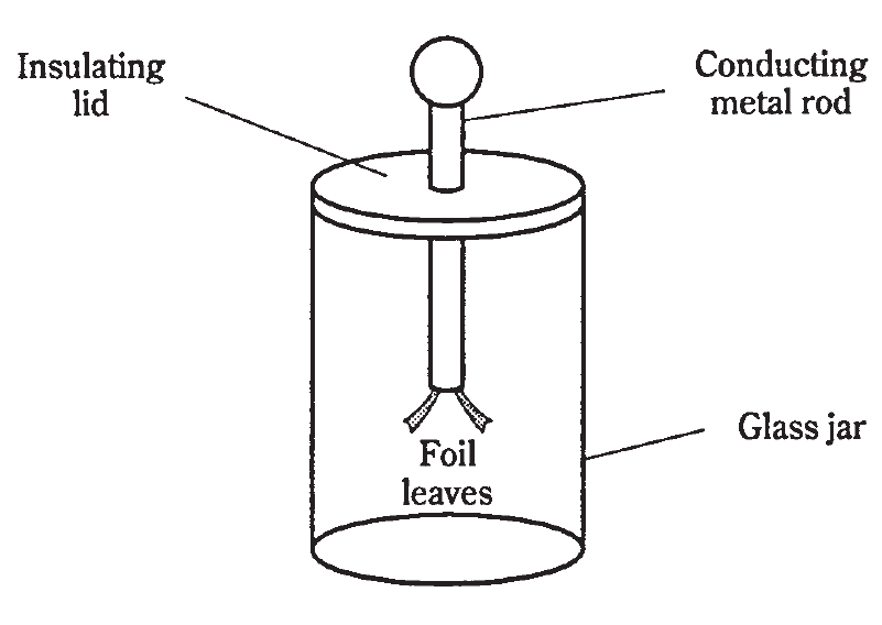 The most common device for demonstrating electrostatic forces is the electroscope. It consists of two foil leaves, attached to a conducting rod, and placed in a sealed container so that air currents will not move the foil leaves (Fig. 1). When a charged object is brought near, or touched to, the contact at the top of the rod, the leaves stand apart from each other. This is because the two leaves become charged with like electric poles—either an excess or a deficiency of electrons—and like poles always repel.