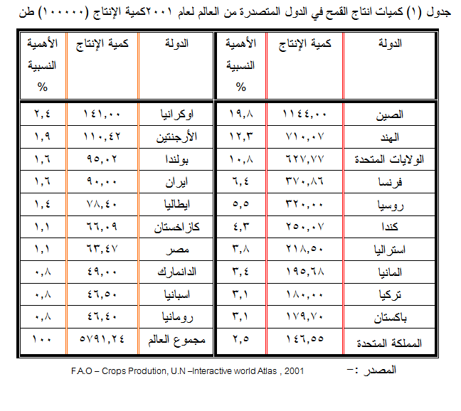 كما اسلفنا بان محصول القمح من اكثر محاصيل الحبوب انتشارا فهو يمتد الى الدائرة القطبية خلال فصل الصيف وقد بلغ عدد الدول المنتجة له في عام 2001 اكثر من 120 دولة كما موضحة في الجدول (1) وبلغت كمية انتاجه حوالي ( 579) مليون طن موزعة بين دول العالم وتأتي الصين في دول العالم اذ تساهم بنسبة 19.8 % من الإنتاج العالمي تليها الهند والولايات المتحدة الأمريكية وفرنسا وروسيا .. وغيرها .