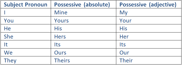 Now that you understand how they work, try using some of these possessive pronouns in your own sentences. Here's a reminder of the possessive forms: