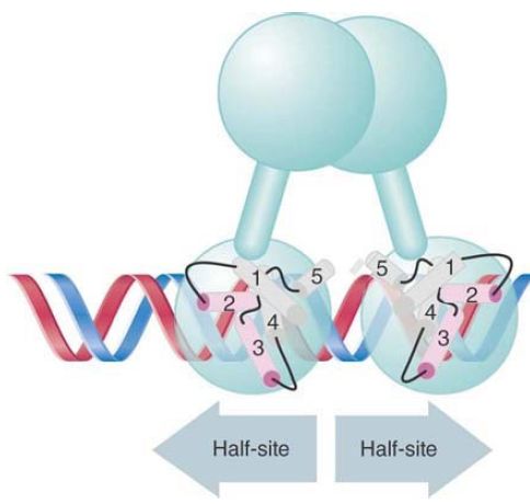 - Each DNA-binding region in the repressor contacts a half-site in the DNA.