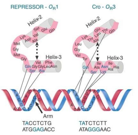 specific target DNA sequence and is therefore also known as the recognition helix. Comparison of the contact patterns illustrated in FIGURE 4shows that the lambda repressor and Cro select different sequences in the DNA as their most favored targets because they have different amino acids in the corresponding positions in helix-3.