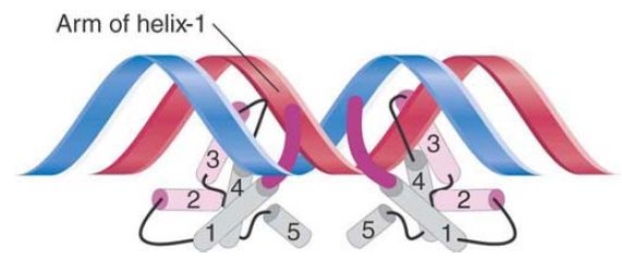 - The DNA-binding site of the repressor includes two short α-helical regions that fit into the successive turns of the major groove of DNA.