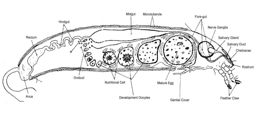 مقطع تخطيطي لأنثى بالغة للنوع Eriophyes tulipae Keifer (عن أبو الحب، 1986)