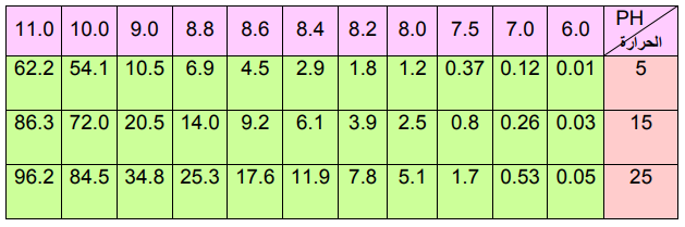 جدول (2 ) النسب المئوية للأمونيا الحرة (NH3 %) في الماء في درجات