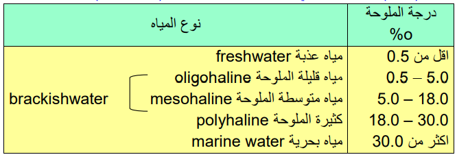 جدول (1) تقسيمات المياه في الطبيعة حسب تركيز الملوحة (جزء بالألف)