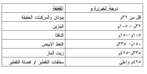 ويمكن القول انه كلما كان النفط خفيفاً ازدادت كمية البنزين والنافثا والنفط الابيض ، اما اذا كان النفط ثقيل فانه يحتوي على نسب اكبر من زيت الوقود ومخلفات التقطير .