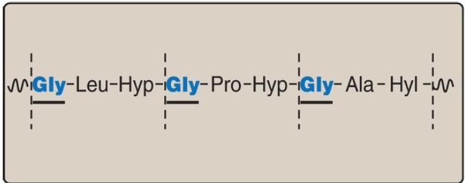 Figure 1: Amino acid sequence of a portion of the α1 chain of collagen. Hyp =hydroxyproline; Hyl = hydroxylysine.