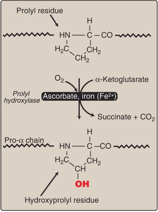 Figure 2: Hydroxylation of proline residues in pro-α chains of collagen by prolyl hydroxylase. [Note: Fe2+ (hydroxylase cofactor) is protected from oxidation to Fe3+ by ascorbate (vitamin C).]