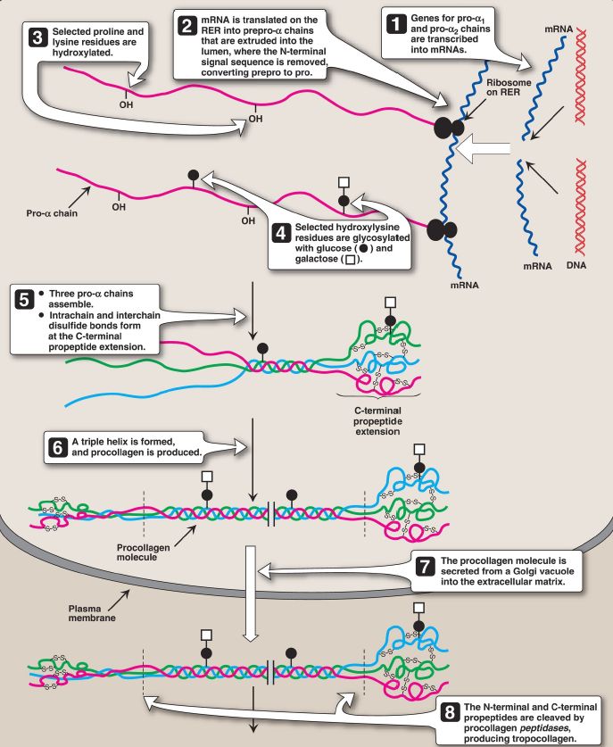 Figure 3: Synthesis of collagen. RER = rough endoplasmic reticulum; mRNA =messenger RNA.