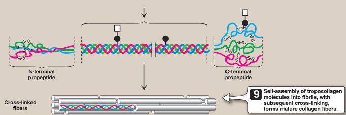 3. Glycosylation: The hydroxyl group of the hydroxylysine residues of collagen may be enzymatically glycosylated. Most commonly, glucose and galactose are sequentially attached to the polypeptide chain prior to triple-helix formation (Fig. 3).