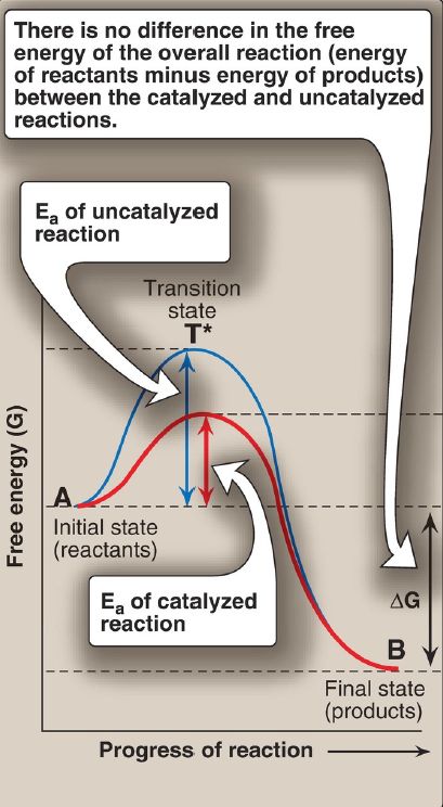 Virtually all chemical reactions have an energy barrier separating the reactants and the products. This barrier, called the activation energy (Ea), is the energy difference between that of the reactants and a high-energy intermediate, the transition state (T*), which is formed during the conversion of reactant to product. Figure 1 shows the changes in energy during the conversion of a molecule of reactant A to product B as it