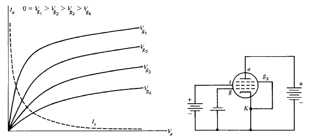 بالنسبة لجهد الأنود وهذا هو سبب إرتداد الإلكترونات الثانوية إلى الأنود. ونادراً ما يسلط جهد موجب صغير على شبكة الكبت بحيث يظل جهدها سالباً بالنسبة لكل من الأنود والشبكة الحاجبة والغرض من هذا الجهد الموجب الصغير هو زيادة التيار المار خلال الصمام الخماسي أي زيادة قدرة الصمام .