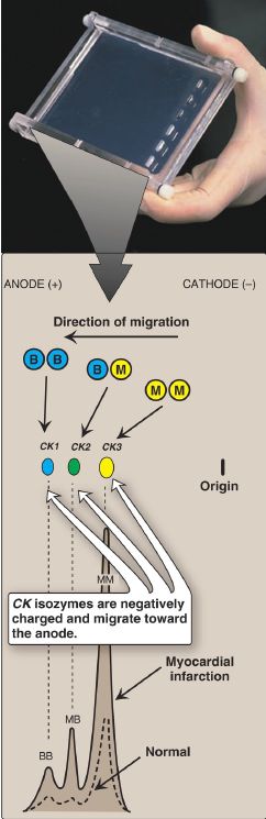 Isoenzymes (also called isozymes) are enzymes that catalyze the same reaction. However, they do not necessarily have the same physical properties because of genetically determined differences in amino acid sequence. For this reason, isoenzymes may contain different numbers of charged amino acids, which allows electrophoresis (the movement of charged particles in an electric field) to separate them (Fig. 1). Different organs commonly contain characteristic proportions of different isoenzymes. The pattern of isoenzymes found in the plasma may, therefore, serve as a means of identifying the site of tissue damage. For example, the plasma levels of creatine kinase (CK) are commonly determined in the diagnosis of myocardial infarction (MI). They are particularly useful when the electrocardiogram (ECG) is difficult to interpret such as when there have been previous episodes of heart disease.