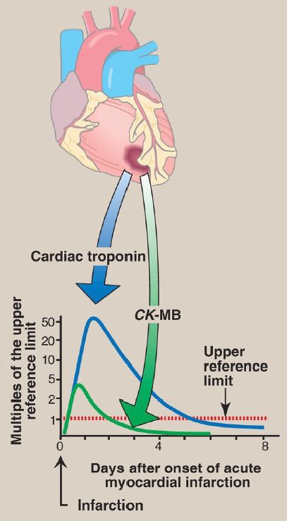 myocardium. Following an acute MI, CK2 appears in plasma within 4–8 hours following onset of chest pain, reaches a peak of activity at ~24 hours, and returns to baseline after 48–72 hours (Fig. 2). Troponins T (TnT) and I (TnI) are regulatory proteins involved in muscle contractility. Cardiac-specific isoforms (cTn) are released into the plasma in response to cardiac damage. They are highly sensitive and specific for damage to cardiac tissue. cTn appear in plasma within 4–6 hours after an MI, peak in 24–36 hours, and remain elevated for 3–10 days. Elevated cTn, in combination with the clinical presentation and characteristic changes in the ECG, are currently considered the “gold standard” in the diagnosis of an MI.