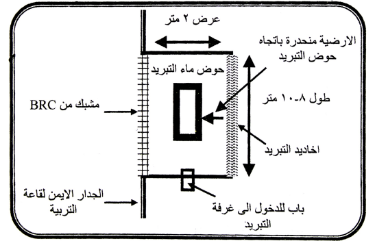 رابعا:- يجب التركيز اثناء البناء لغرفة التبريد بأن جدران هذه الغرفة ستتعرض للماء المستمر ويجب ان تكون الأرضية منحدرة بشدة بشكل يضمن رجوع الماء الزائد الى حوض التبريد المتواجد في غرفة التبريد.