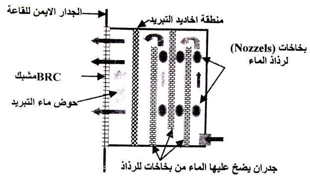• وضع حوض ماء التبريد في المسافة المحصورة بين القاعة والأخاديد المرطبة بالماء وذلك لحمايته من أشعة الشمس وتسهيل سحب الماء وضخه لترطيب اخاديد التبريد.