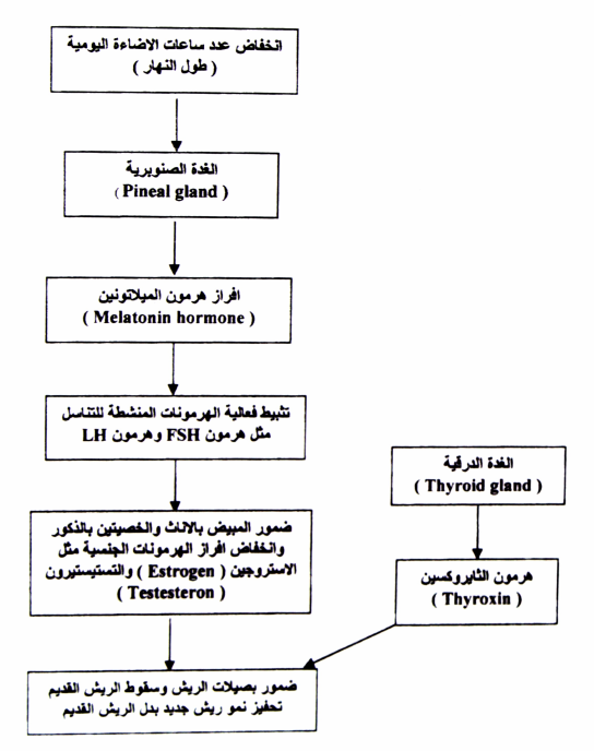 عند انخفاض طول النهار سوف تشعر الساعة البيولوجية لجسم الطير بان عليها ان توقف وتثبط النشاطات الجنسية حيث يفرز هرمون الميلاتونين (Melatonin) من الغدة الصنوبرية (Pineal gland) ليقوم بتثبيط الهرمونات المنشطة للجنس مثل الهرمون المحفز لنمو الحويصلات المبيضية FSH (Follical stimulating hormone) وهرمون التبويضLH) Leutirizing hormone ) واللذان يفرزان من الفص الأمامي للغدة النخامية. هذا التثبيط لهرمون الميلاتونين لهذه الهرمونات المنشطة للجنس قد يأتي من خلال ميكانيكيتين وهما: