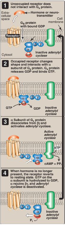 1. Guanosine triphosphate–dependent regulatory proteins: The effect of the activated, occupied GPCR on second messenger formation is indirect, mediated by specialized trimeric proteins (α, β, and γ subunits) of the cell membrane. These proteins, referred to as G proteins because the α subunit binds guanosine di- or triphosphates (GDP or GTP), form a link in the chain of communication between the receptor and AC. In the inactive form of a G protein, the α subunit is bound to GDP (Fig. 1).