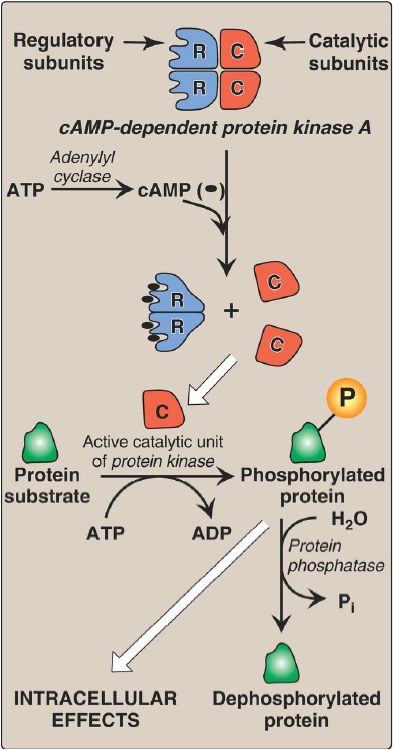 2. Protein kinases: The next step in the cAMP second messenger system is the activation of a family of enzymes called cAMP-dependent protein kinases such as protein kinase A (PKA), as shown in Figure 2. cAMP activates PKA by binding to its two regulatory subunits, causing the release of its two catalytically active subunits. These subunits transfer phosphate from ATP to specific serine or threonine residues of protein substrates. The phosphorylated proteins may act directly on the cell’s ion channels or, if enzymes, may become activated or inhibited. [Note: Several types of protein kinases are not cAMP dependent, for example, protein kinase C]