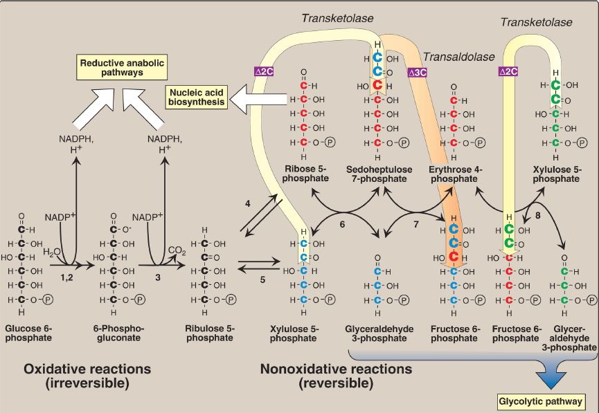 Figure 1: Reactions of the pentose phosphate pathway. Enzymes numbered above are: (1, 2) glucose 6-phosphate dehydrogenase and 6-phosphogluconolactone hydrolase, (3) 6-phosphogluconate dehydrogenase, (4) ribose 5-phosphate isomerase, (5) phosphopentose epimerase, (6, 8) transketolase (coenzyme: thiamine pyrophosphate), and (7) transaldolase. Δ2C = two carbons are transferred from a ketose donor to an aldose acceptor in transketolase reactions; Δ3C = three carbons are transferred in the transaldolase reaction. This can be represented as: 5C sugar + 5C sugar 7C sugar + 3C